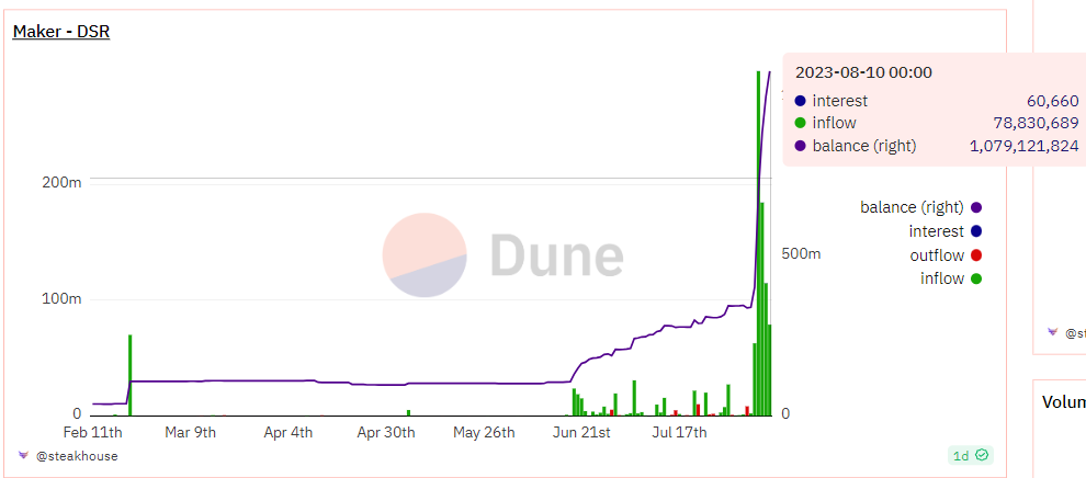 The 8% rate caused an expected surge in Dai deposits immediately, as this is effectively risk-free in the stablecoin framework. (Source: https://dune.com/SebVentures/maker---accounting_1)