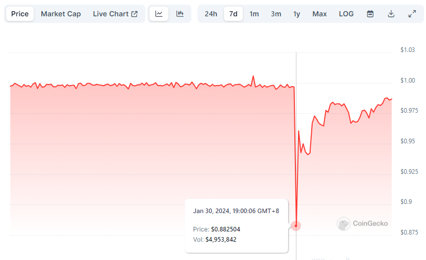 On 30 Jan 2024, Abracadabra's two V4 cauldrons, yv-3crypto and MagicAPE, were hacked and huge amounts of un-collateralised MIM were minted out of these two cauldrons. Hacker subsequently dumped MIM for ETH, causing MIM to depeg sharply, but soon recovered substantially.