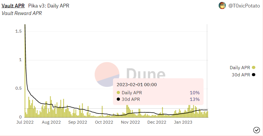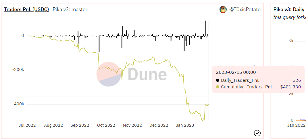 Traders have been losing money since July 2022. Since then, the vault has received about $320k in fees and earned $401k of traders' losses. More details are at official Dune dashboard https://dune.com/T0xicPotato/Pika-Protocol .