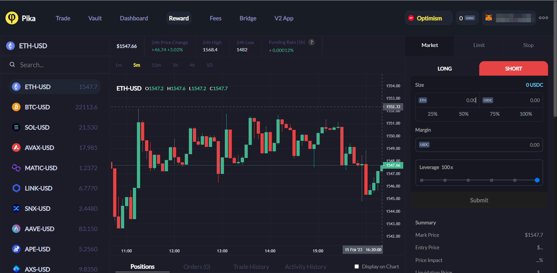 Pika Protocol is a derivatives trading platform on Optimism, where users can trade perpetuals up to 100x leverage. Pika uses USDC as collateral and a vault is set up to be the counter-party of traders.
